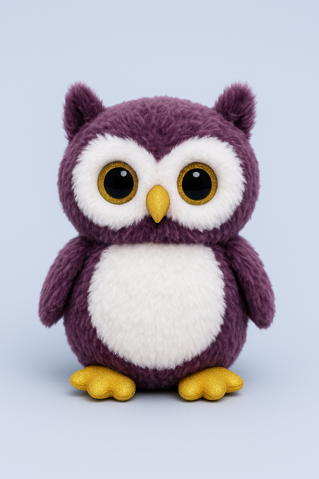 Adorable purple owl plush with golden feet and beak, crafted from ultra-soft fabric for endless cuddles. Perfect for gifting or decorating any room.